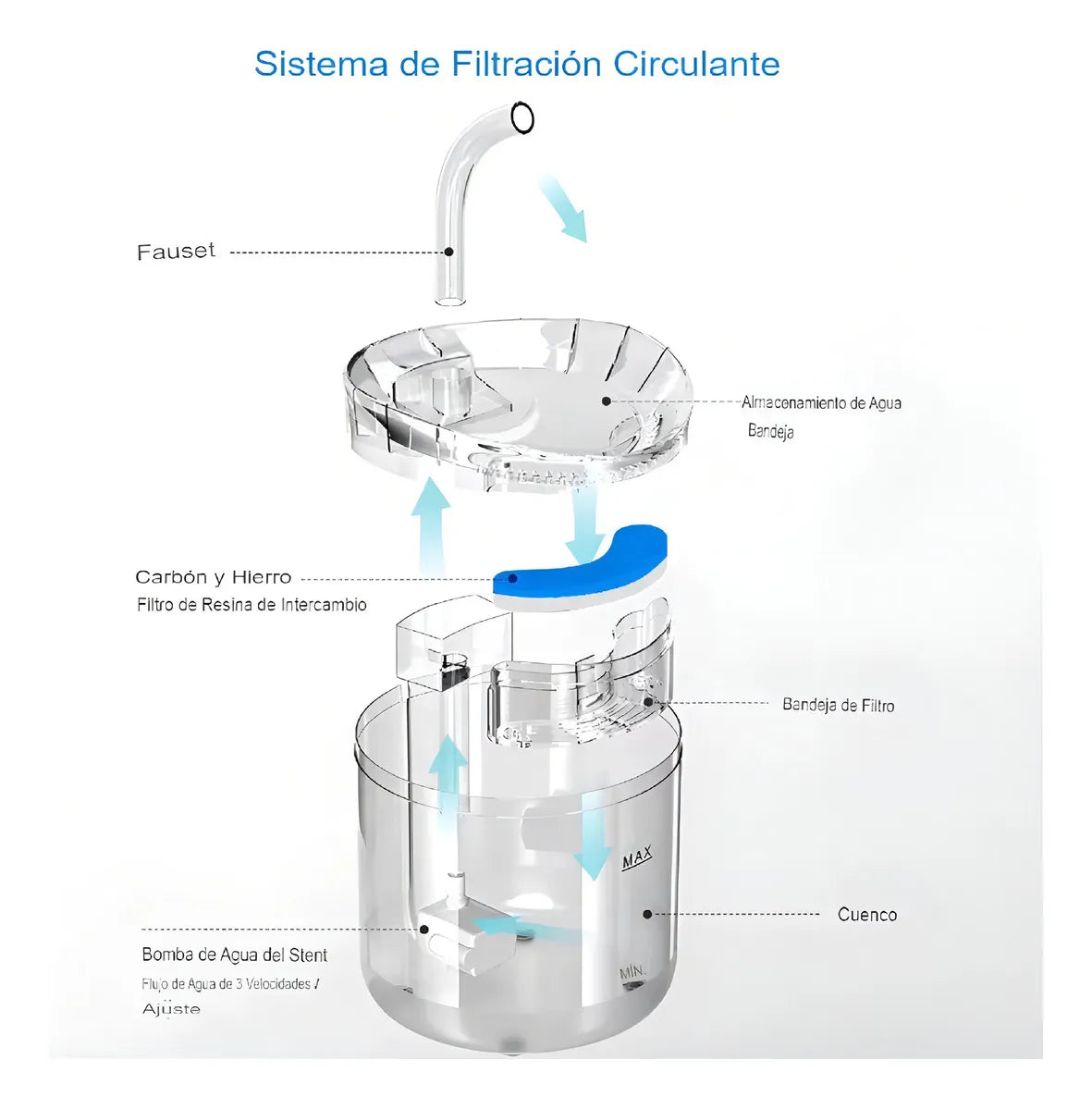 Este ingenioso equipo incorpora una bomba eléctrica que circula el agua, manteniéndola fresca y en movimiento, lo que a manudo atrae a las mascotas a beber mas. Además su sistema de filtración puede eliminar impurezas y garantizar que el agua este limpia y saludable.
